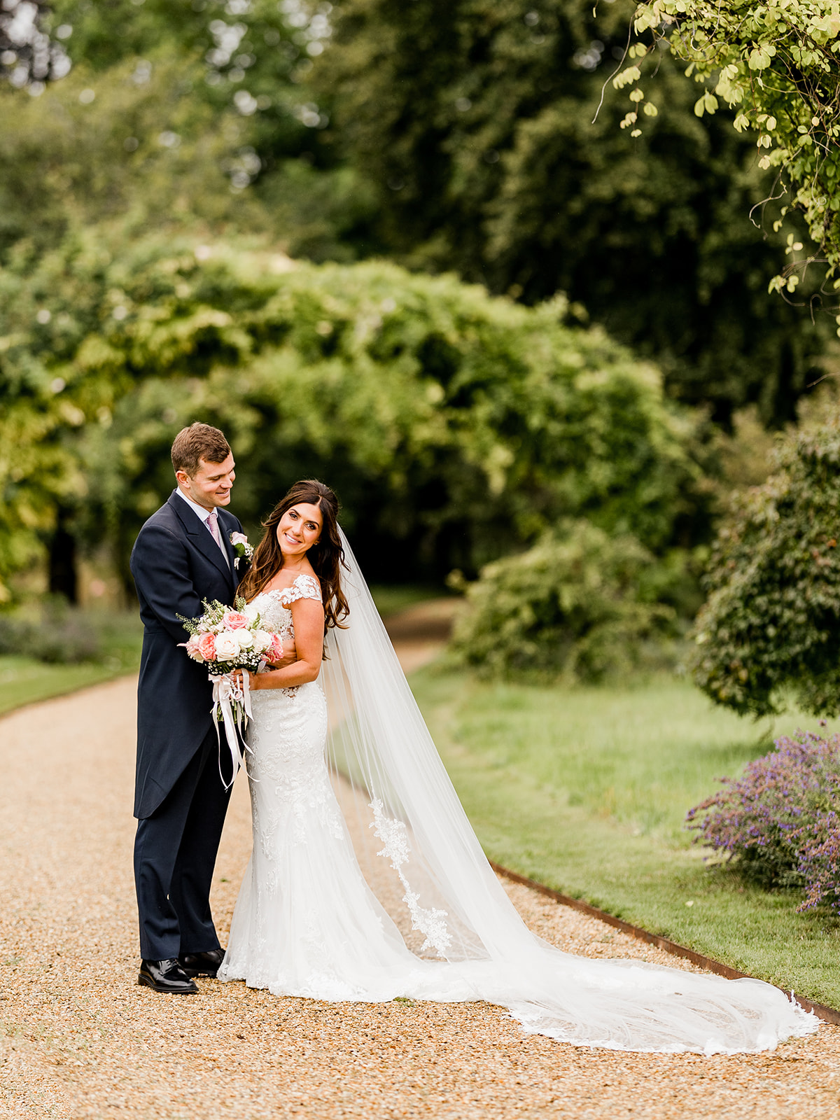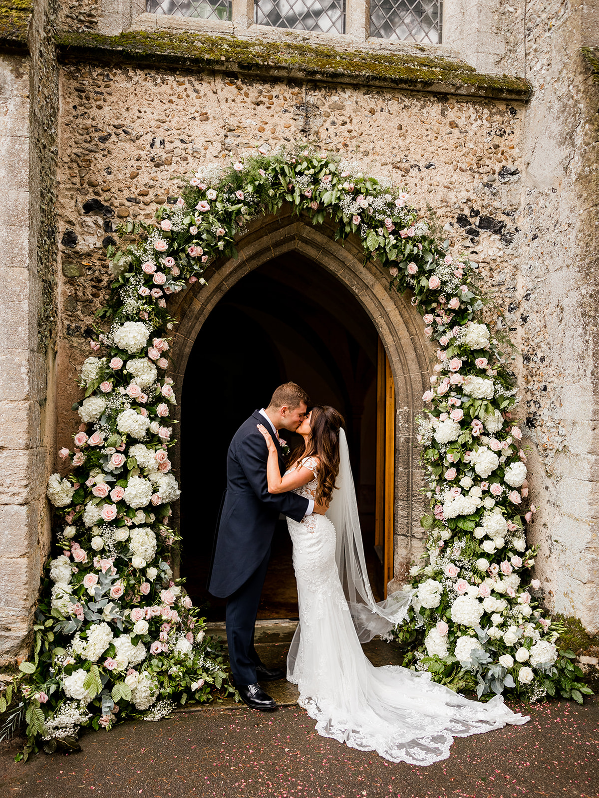 Kelsey then arrived at the stunning St Peter & St Mary Magdalene Church through the most magnificent flower arch of pink and white flowers. After the service and of course some confetti we headed back to Chippenham Park for their champagne drinks reception and after a stroll round the gardens for some couple portraits the heavens opened and we ran back inside for some family portraits in The Old Ballroom. The rain wasn’t dampening anyones spirits however and Billy & Kelsey danced under umbrellas to their wedding reception where they were greeted by the truly sensational Function Band for their entrance to their wedding breakfast.